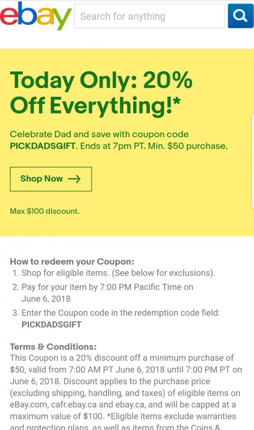 This Coupon is a 20% discount off a minimum purchase of $50, valid from 7:00 AM PT June 6, 2018 until 7:00 PM PT on June 6, 2018. Discount applies to the purchase price (excluding shipping, handling, and taxes) of eligible items on eBay.com, cafr.ebay.ca and ebay.ca, and will be capped at a maximum value of $100. *Eligible items exclude warranties and protection plans, as well as items from the Coins & Paper Money, Gift Cards & Coupons, and Real Estate categories.