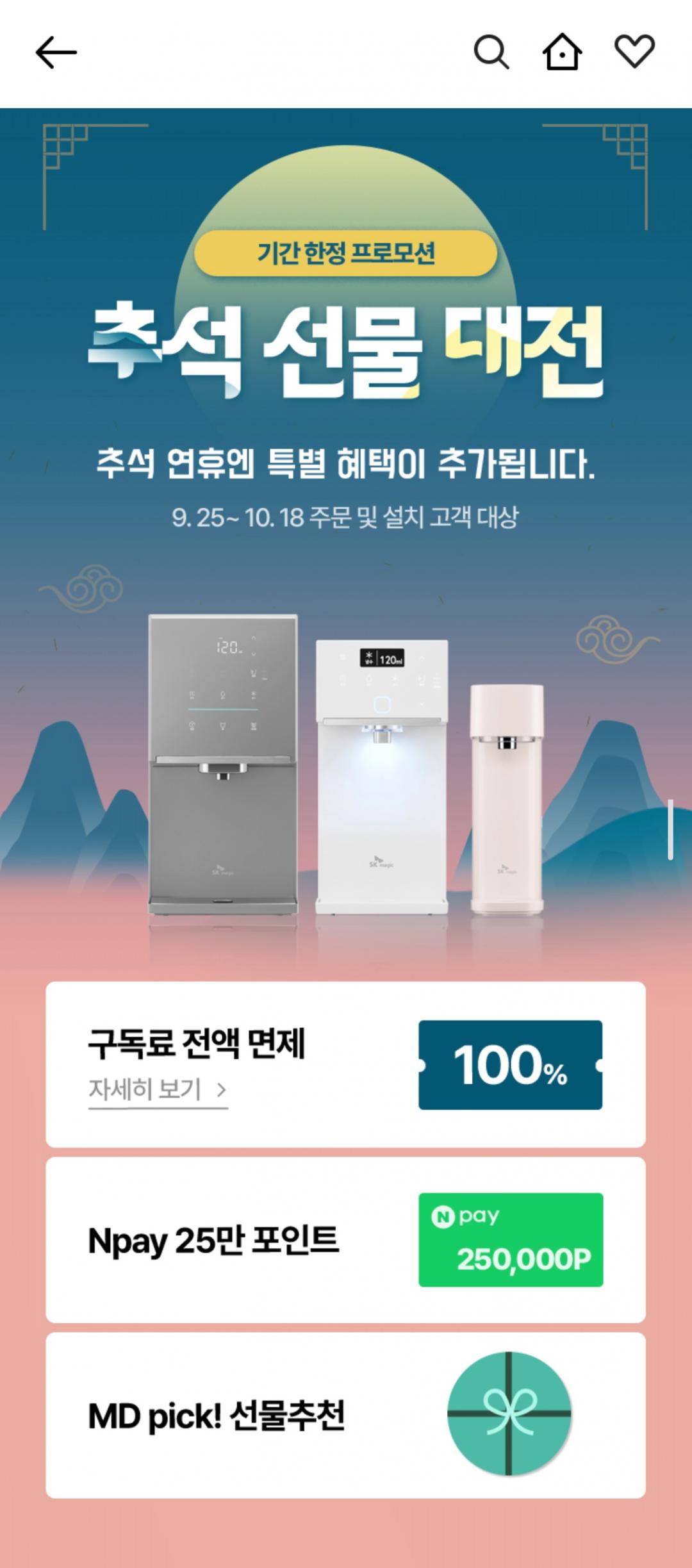 원코크플러스얼음물정수기/초소형플러스직수정수기/뉴미니정수기 등 제휴카드 있으면 구독료 면제,네이버페이 최대 25만원 증정 등 이벤트 많이하네요