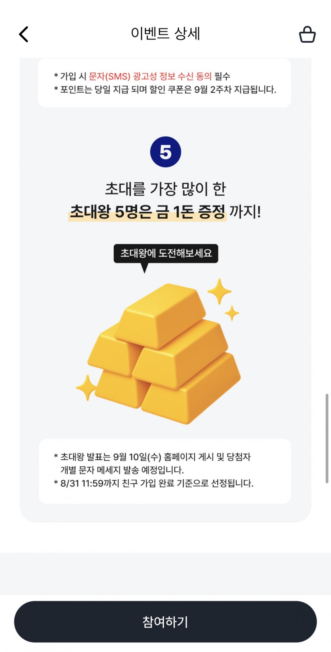 제일 많이 초대한 사람 5분한테 금 1돈 지급된다고 합니다.