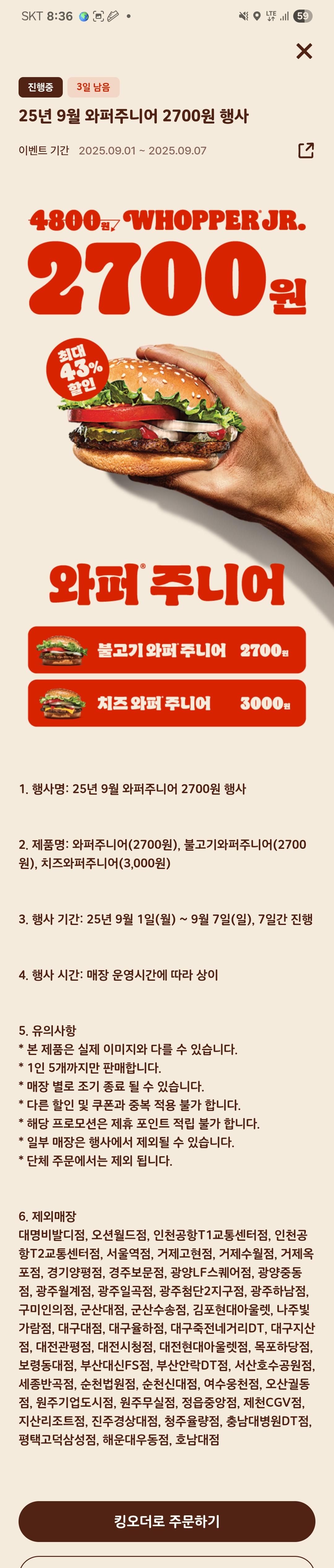[버거킹] 와퍼주니어 할인 2,700원 ~9/7