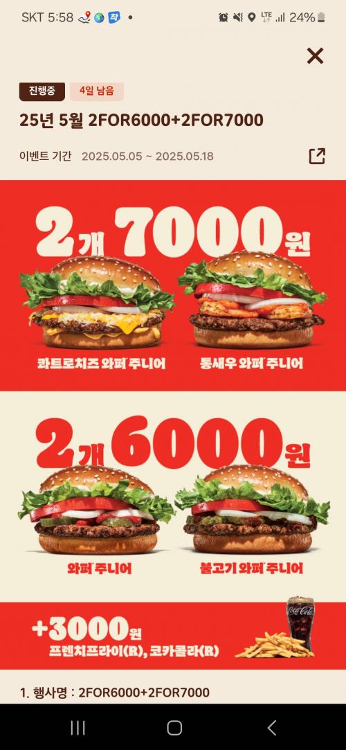 [버거킹] 와퍼주니어 2개 6,000원 5/18까지 > 이벤트게시판