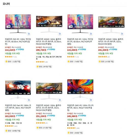 이번 행사에서는 게이밍과 업무를 모두 만족시킬 수 있는 다양한 모니터 제품을 특별한 가격에 만나볼 수 있습니다. 픽셀아트 FHD IPS 120Hz 게이밍 모니터는 선명한 화질과 부드러운 화면 전환으로 게임 플레이에 최적화되어 있으며, 울트라 와이드 165Hz 모니터는 넓은 시야각과 몰입감을 제공해 영상 편집이나 멀티태스킹에도 탁월합니다. 또한 QHD 해상도와 100Hz 주사율을 지원하는 제품은 장시간 사용에도 눈의 피로를 줄여주어 업무용으로도 적합합니다.