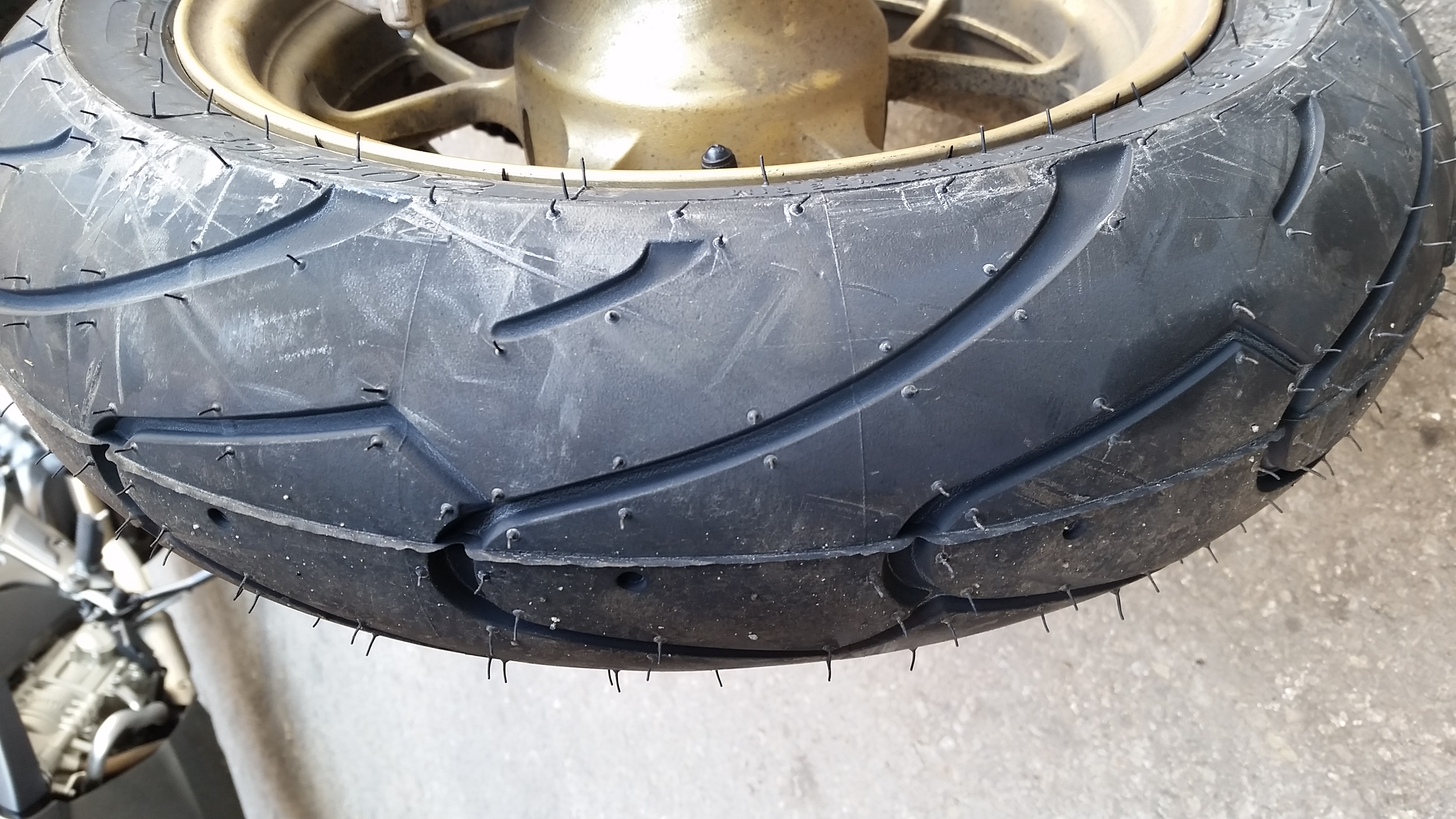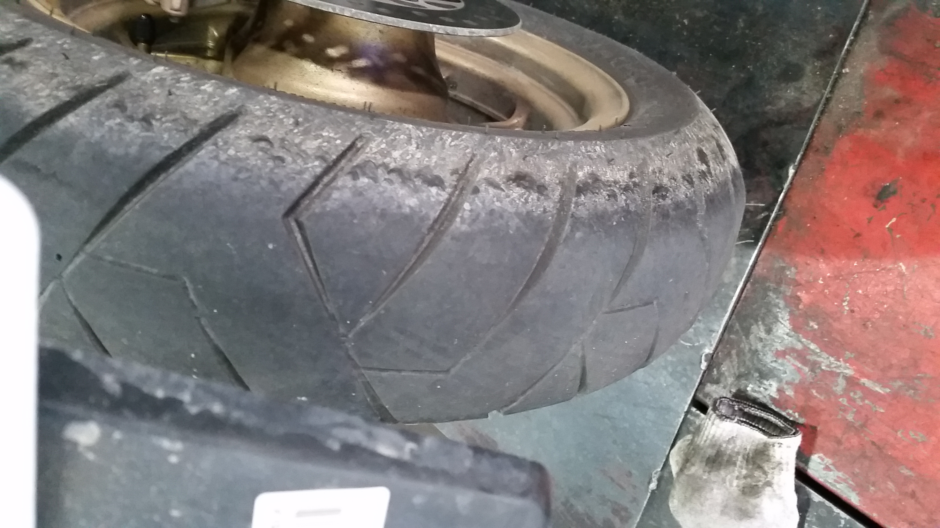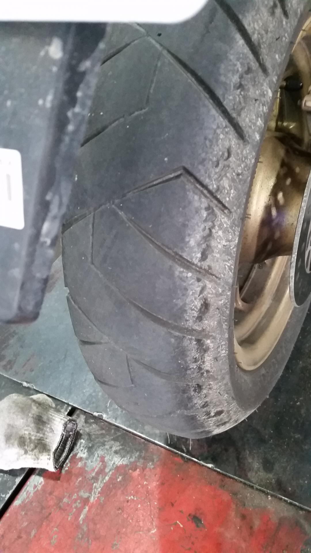 11750km탄 MSX125순정 뒷타이어~제꺼는 마모한계선이 지면에 닿았고 미하엘님꺼는 아직 좀 남아있네요ㅋ체중차이로 인해 마일리지가 좀더 긴것 같습니다~