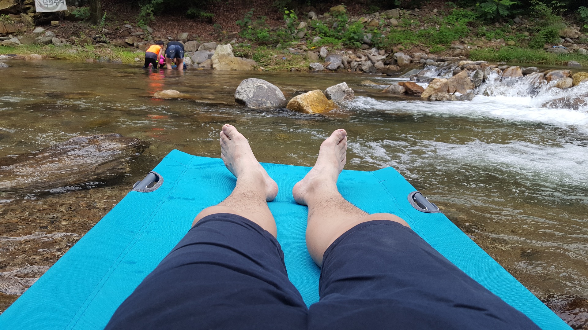 근처 계곡 옆 백숙집에서 닭백숙 먹고 물놀이 중이에요...