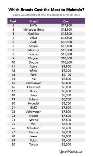 역시 일본 제조사들, 특히 도요타의 브랜드(도요타, 싸이언, 렉서스)들이 유지비가 가장 저렴하네요.