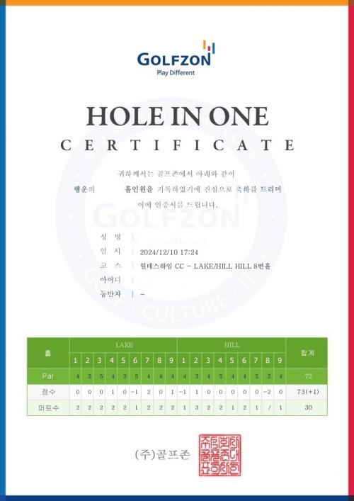 감사합니다. 골프존 앱의 해당 라운드 스코어카드 들어가시면 최상단 왼쪽에 '홀인원 인증서 확인하기' 들어가시면 됩니다. | ||