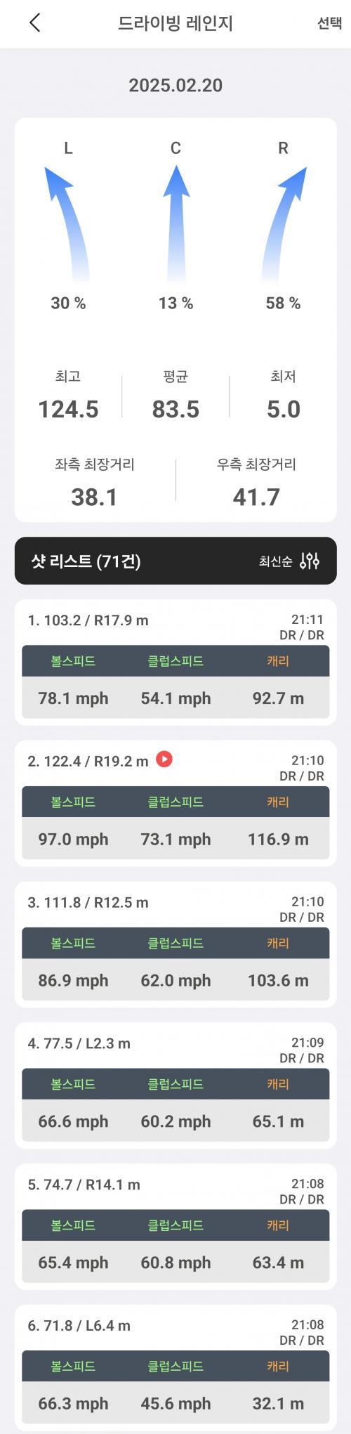 드라이버 선택에 도움이 될지 모르겠지만 태어나서 처음 클럽 잡고 골프공 쳐본 데이터 첨부합니다.
