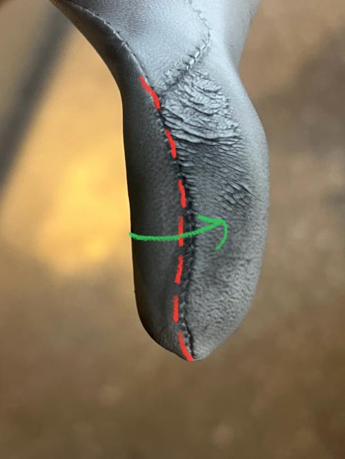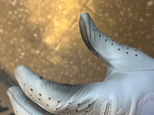 엄지손가락 부분이 돌아가서 실밥있는 부분이 엄지손가락 지문 위로 올라옵니다 (사진)