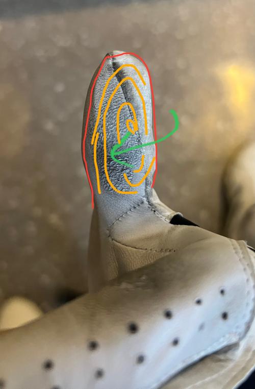 녹색 화살표 방향으로 장갑이 돌아가면서 실밥 라인이 지문 쪽으로 돌아가서 찝혀요