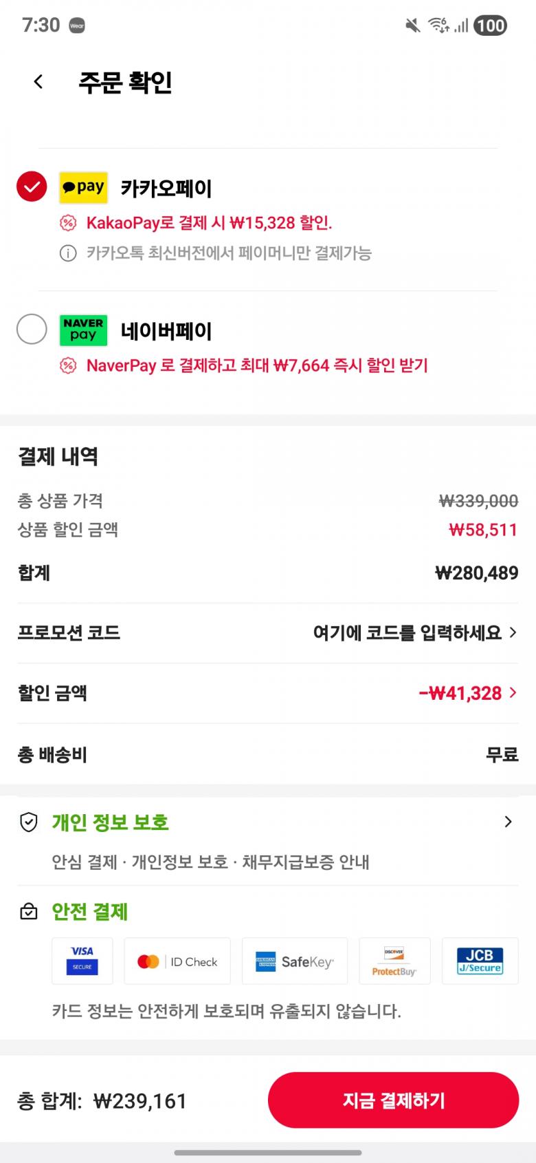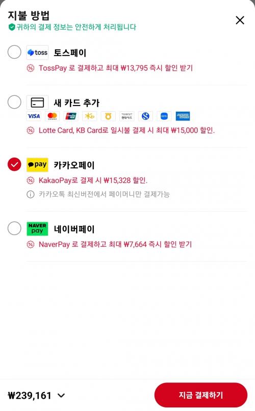국민카드, 롯데카드, 카카오페이 적용시 가격