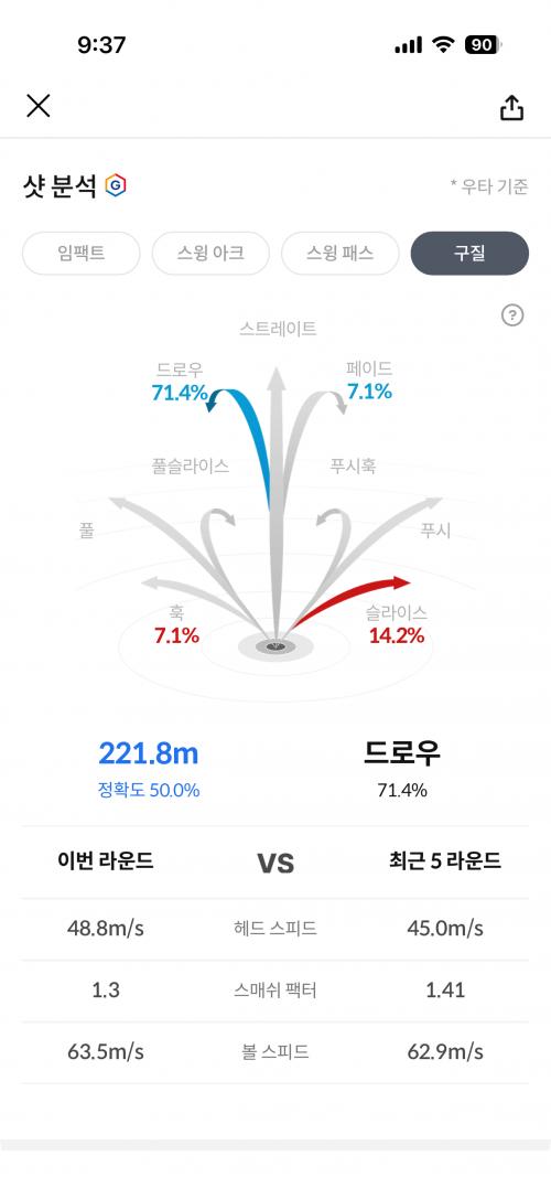 골프존 구질은 보정이 들어가서 신뢰가 떨어지긴 하지만, 헤드스피드대비 스매시팩터가 작은걸로 봐선 센타에서 토쪽에 공이 맞아서 그런거 아닐까요? 타점이 좀 모이면 70 곧 가겠습니다 | ||