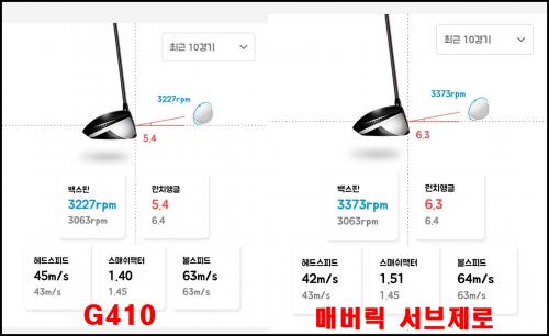 위 사진은 골프존 골프대디 앱에서 확인할 수 있는 드라이버 수치입니다. 데이터가 정확하진 않겠지만 그래도 비교해보려고 올렸습니다. 같은 코스(파라지오cc)에서 친 것을 비교한 것이고 신기하게도 헤드스피드는 G410이 더 나오는데 볼스피드는 매버릭이 더 잘 나옵니다. 스매쉬펙터값의 차이인 것 같은데 매버릭에 적응되면 헤드스피드가 좀 더 늘어나지 않을까 하는 기대감은 생깁니다.