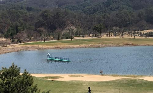 중계 때 TV로 송출되는 대회 간판(?)도 마지막 홀 호수에 설치되어있었고요.