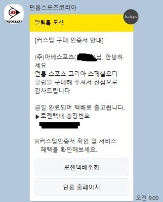 기분좋은 알림이실텐데.. 던롭 알림톡이면 아베스포츠로 보내는 택배 아닌가요? ^^ | ||