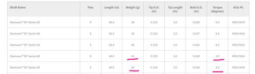 아래 표기한 두 샤프트를 보면..무게만 차이가 있을 뿐 다른 스펙은 같습니다.