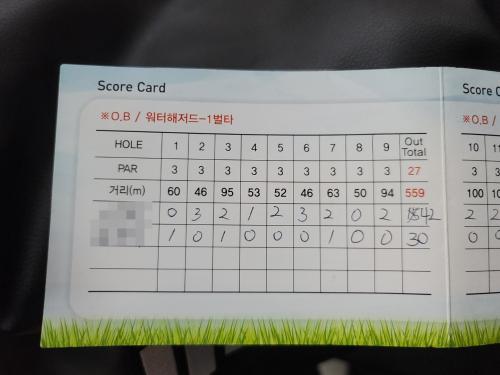 그리고 카트엔 스코어카드도 작성할 수 있게 카드랑 볼펜이 비치 되어있어서 한번 적어봤습니다.