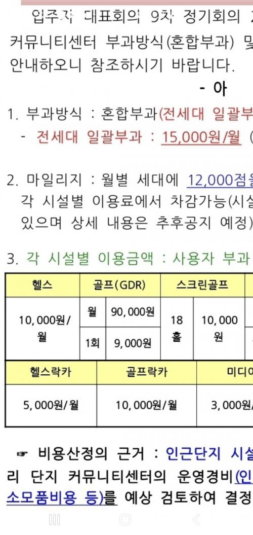 저희 아파트는 전 세대 일괄부과 방식으로 한달에 세대당 3만원 정도를 부과하고, 골프장, 헬스장, 수영장, 사우나 등 모든 운동 시설 및 독서실, 영화관, 노래방 등 편의시설을 누구든지 시간 제약없이 이용할 수 있습니다.