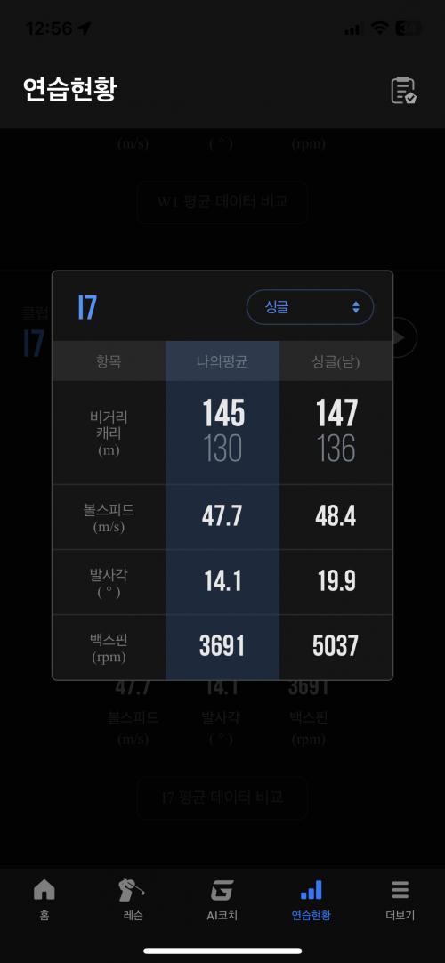 7번 아이언 기준 첨부한 파일은 반스윙 이것저것 하면서 평균 데이터이며