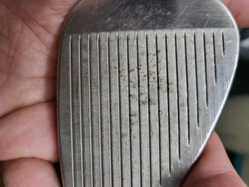 색상 문제라기보다 이 의견에 한표드립니다. 공에 모레, 돌 뭍어있는 상태에서 로프트가 큰 (백스핀이 많이 먹는) 클럽을 치면 표면이 마찰이 많아서 페이스가 손상되고 그 부분이 수분에 노출되면 녹이 발생합니다. (우중 골프 치면 높은 확률로 발생)