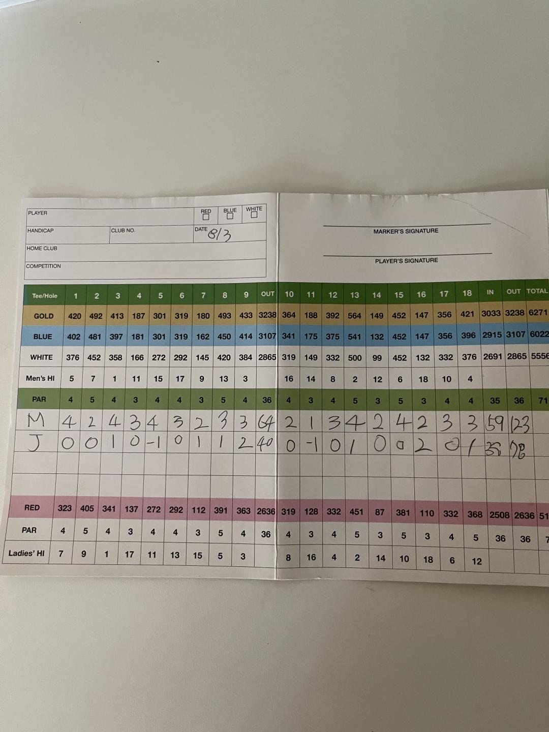 수개월 전부터 레슨받으며 골프를 배우던 와이프, 드디어 오늘 생애 첫 라운드를 하였습니다. 연습할 때 보니 폼이 좋아 기대는 했는데, 역시 그 기대를 저버리지 않았네요. 아쉽게도 파는 놓쳤지만 보기도 하나 기록했습니다.
