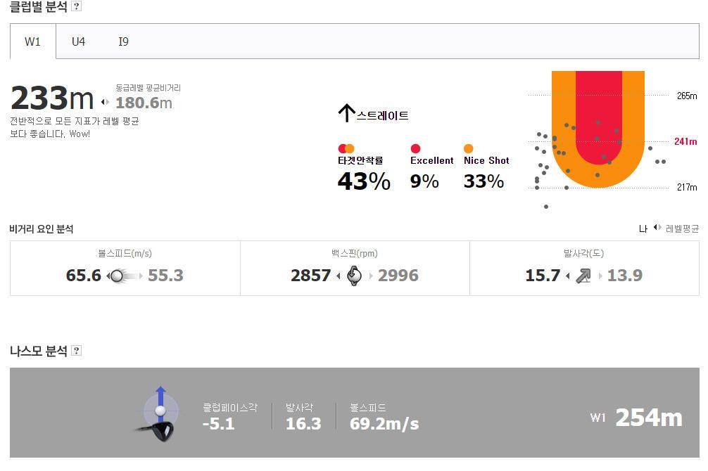 평균 볼스피드가 중요한거 같습니다. 저도 제대로 때리면 72도 나오긴 하는데 이건 한번씩 나오는거라.. 필드에서도 평균으로는 210~220m 정도 치는거 같습니다. (IP핀보다 조금 앞)