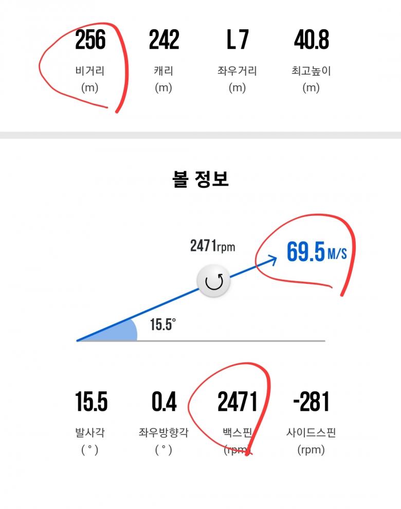 볼스 70.5 백스핀2578 발사각15.1 비거리 261