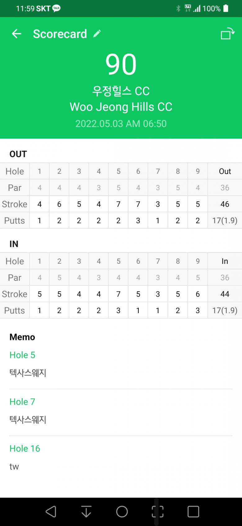 페어웨이 여부 / 퍼팅수 직접 다 적습니다.