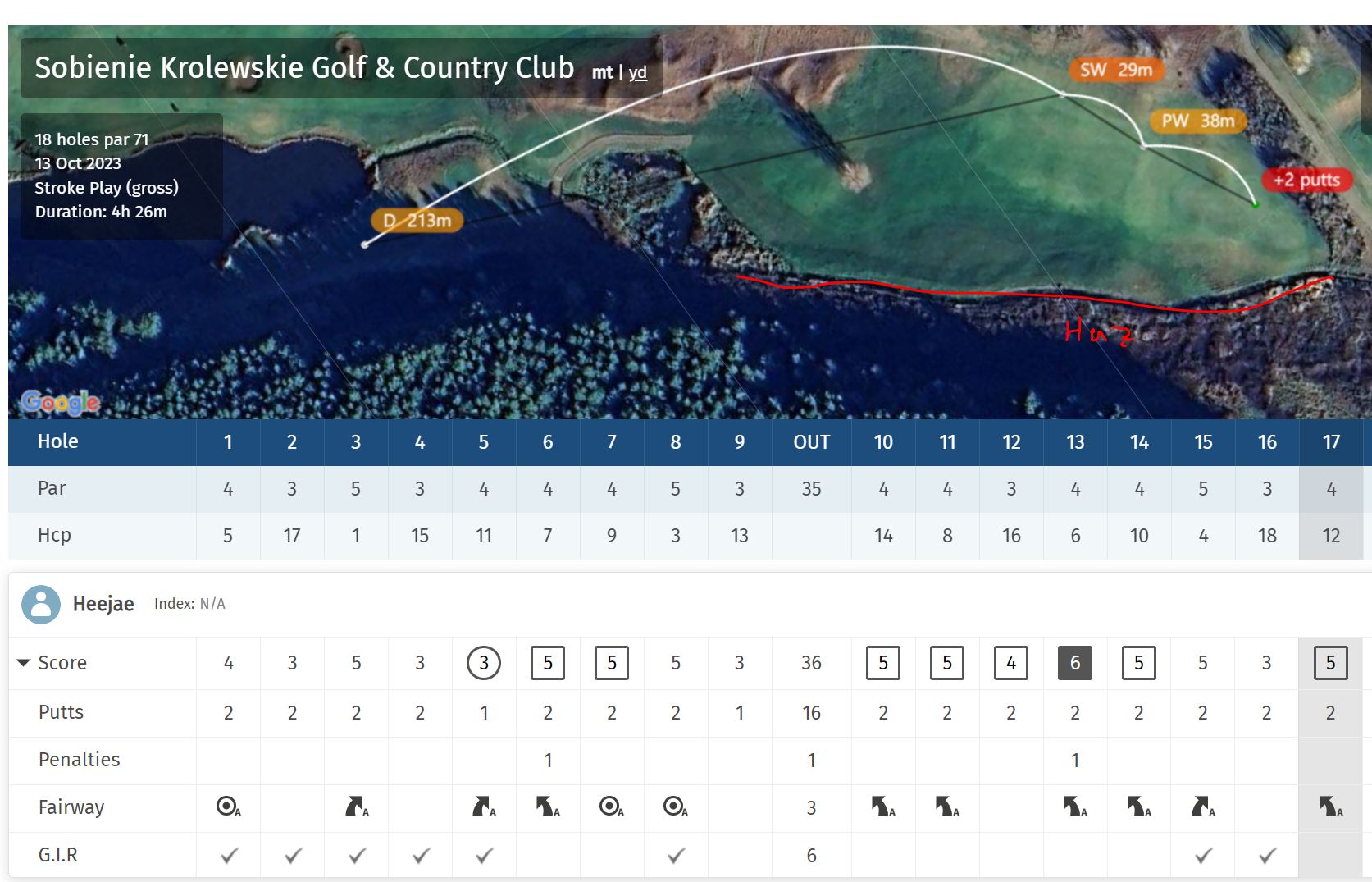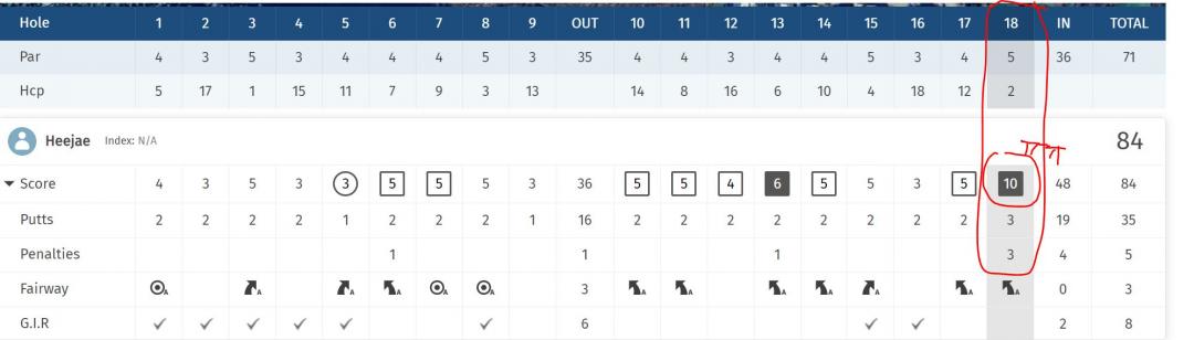후반을 달리며 악성 훅이 또 발생해서 훅으로 티샷이 2개나 해저드로 죽거나 해저드 바로 옆.. (10, 13번)