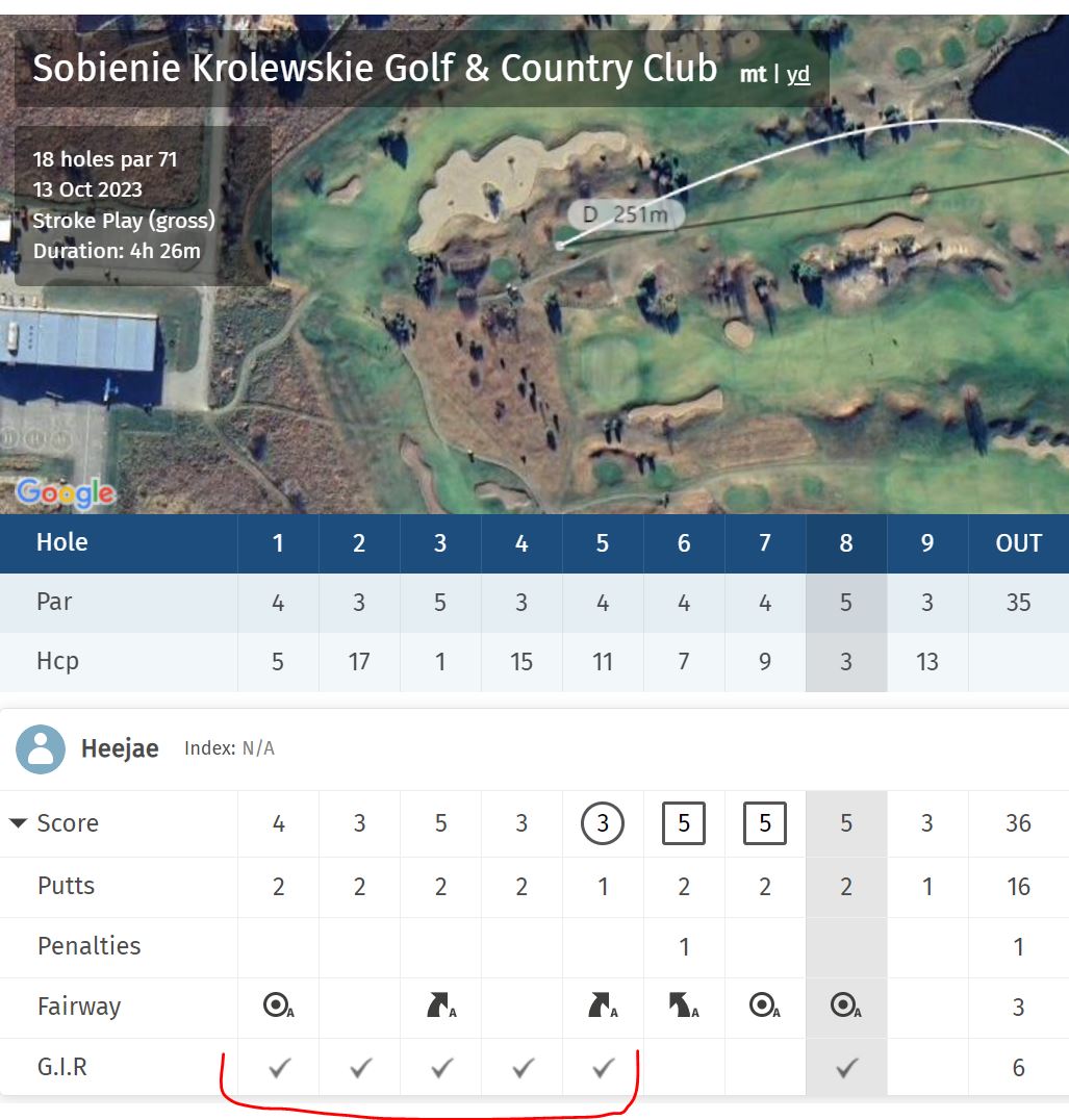 2번 파3 원온, 3번 파5 쓰리온,, ... 5번 홀까지 모두 그린 적중 했습니다..