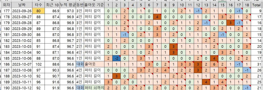기록도 정리하시고 열심히하시니 실력은 언제나 노력한만큼 올라가는 것 같습니다. 저도 한 10번의 라운드를 매번 9-10개 정도 치다가 갑자기 94개도 한번 치고 또 다시 내려오기도하고 그러더라고요.(근데 또 그와중에 죽어도 7자는 못봤네요. ㅠㅠ) 그날의 컨디션과 날씨 등에 영향이 많은 스포츠라 그런듯해요.