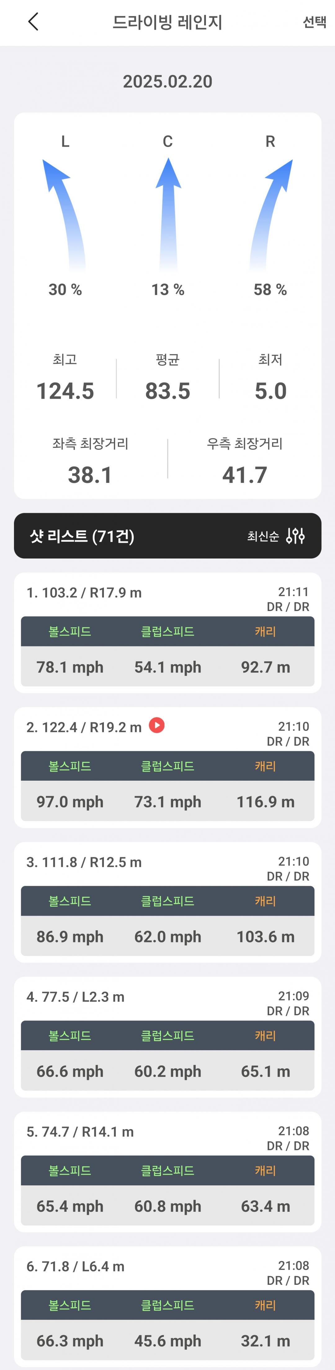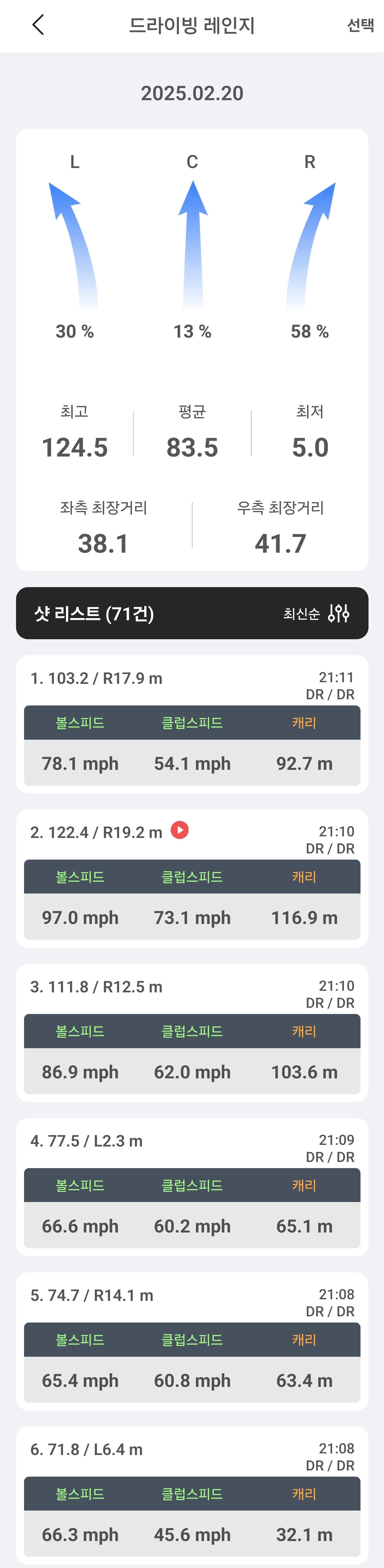 드라이버 선택에 도움이 될지 모르겠지만 태어나서 처음 클럽 잡고 골프공 쳐본 데이터 첨부합니다.