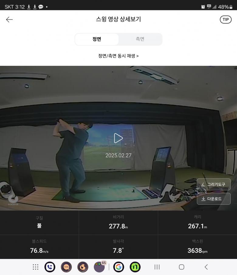 현재 인도어 연습장에서 60s 드라이버 쳐보면 볼스피드 평균 77~78 , 비거리 는 평균 대략 275 정도 나오는듯.합니다.