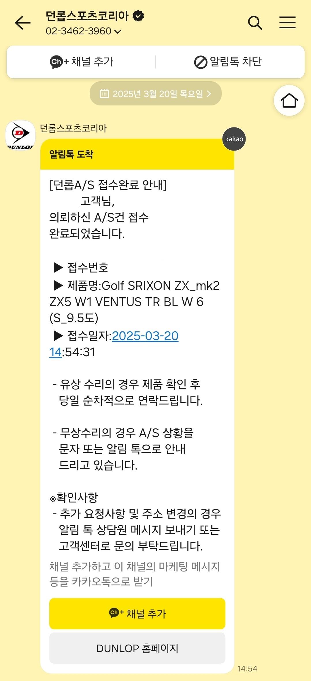 직접전화 접수는 안하고 구매했던 ak골프지점에서 당일접수해주신 듯 합니다! |
