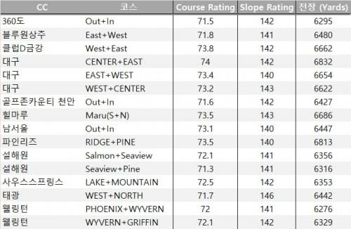 골프협회에서 매년 게시하는 국내 구장 코스 레이팅 참고하여