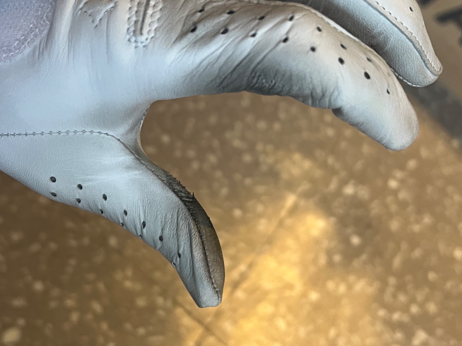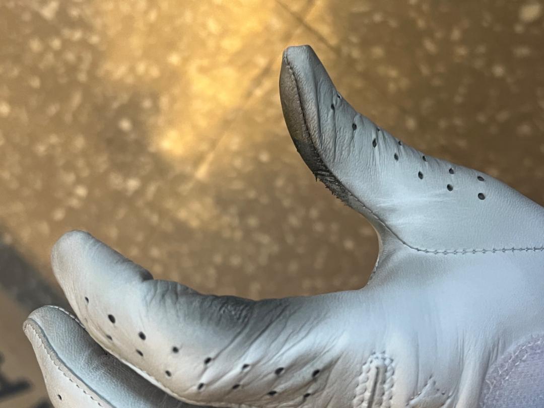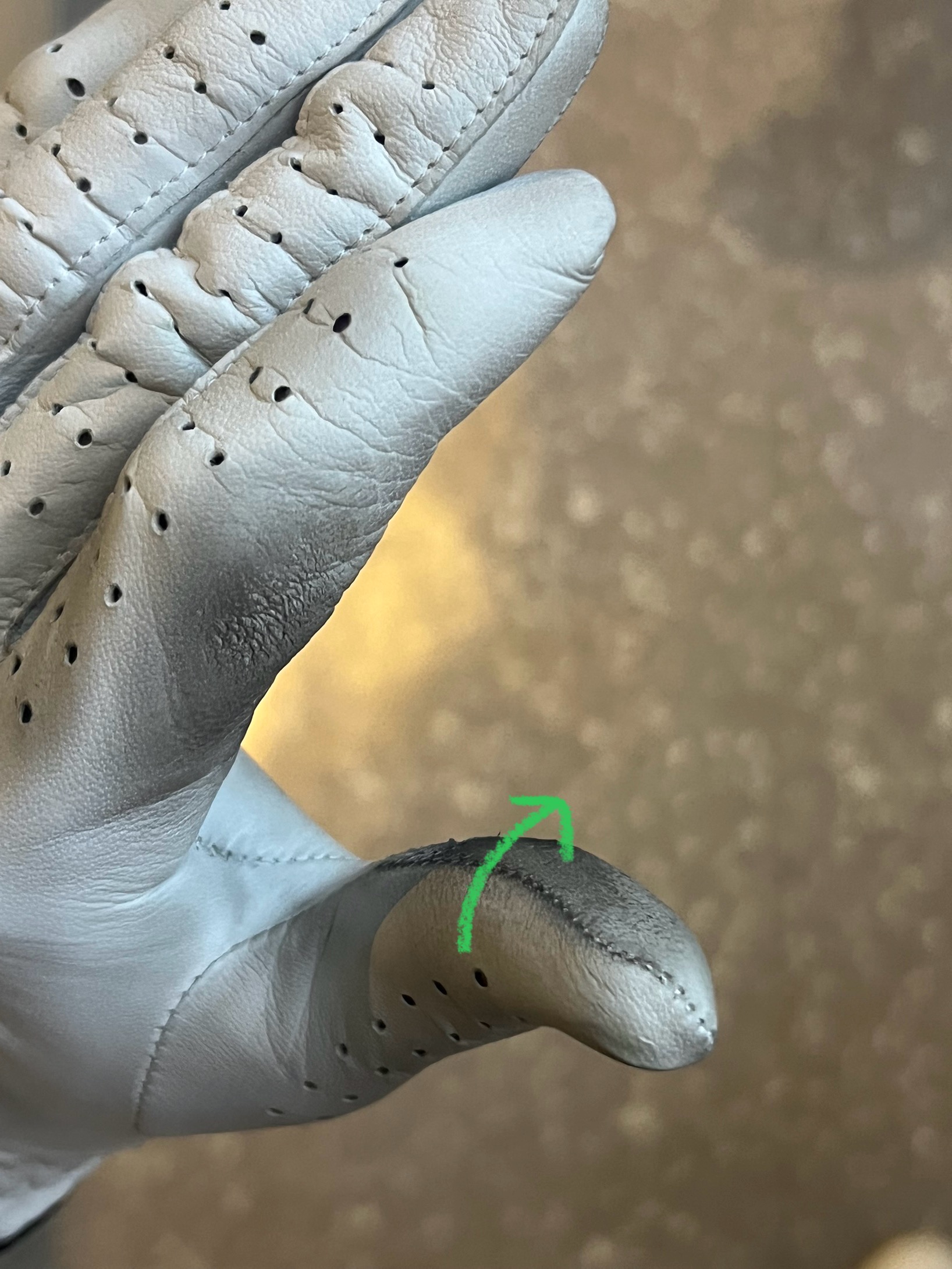 엄지손가락 부분이 돌아가서 실밥있는 부분이 엄지손가락 지문 위로 올라옵니다 (사진)