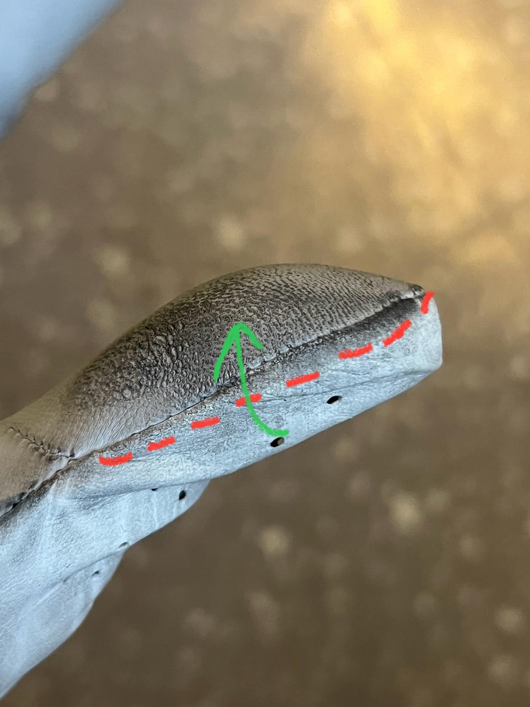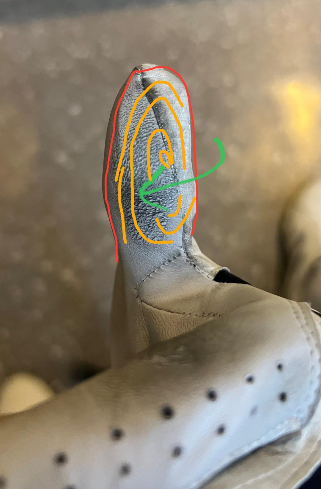 녹색 화살표 방향으로 장갑이 돌아가면서 실밥 라인이 지문 쪽으로 돌아가서 찝혀요