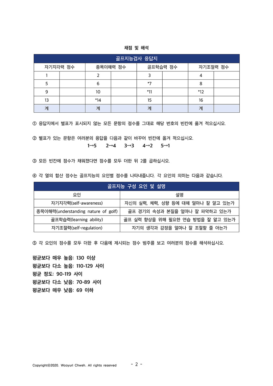 자기지각력 22, 종목이해력 32, 골프학습력 16, 자기조절력 30...