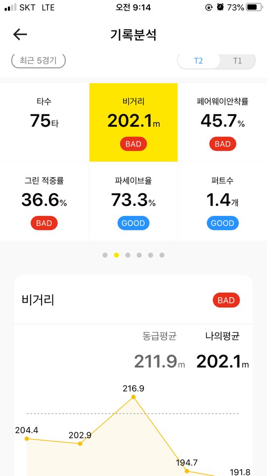 ** 최근 5게임의 드라이버 비거리 인데.. 216미터가 G400을 쓸때의 거리입니다.