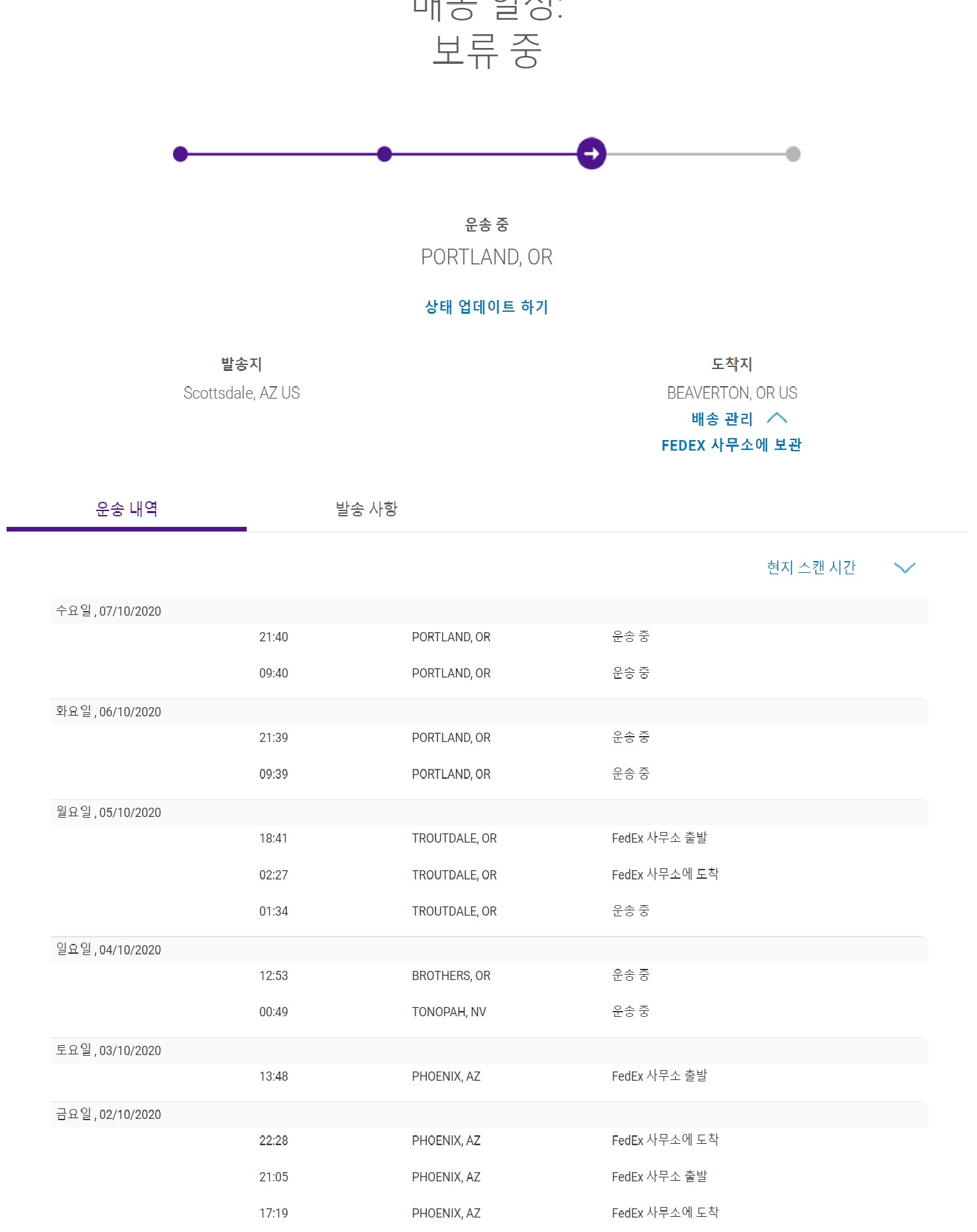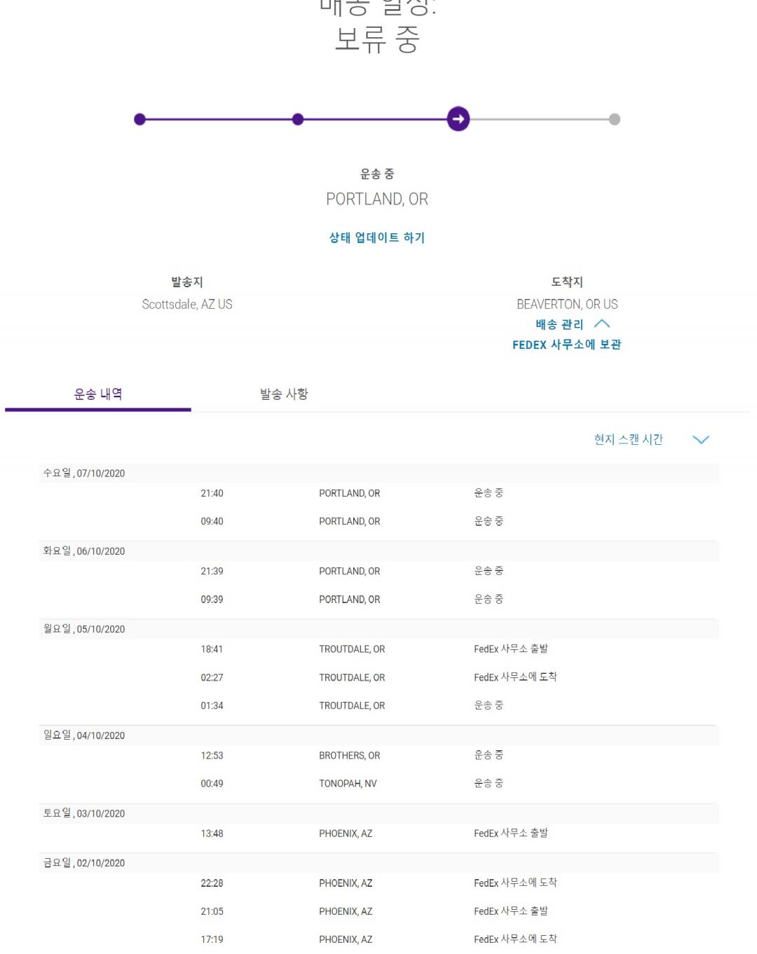 전 9월 25일 우드 주문했고 출발은 10월 1일에 됐는데 배대지 다와서 저렇게 멈춰 있네요. 페덱스 전화해보니 오레곤주 산불 이슈도 있고 물량도 많다고 언제 도착할지 확인을 못해준다고 합니다 ㅠ 그냥 기다려보래요