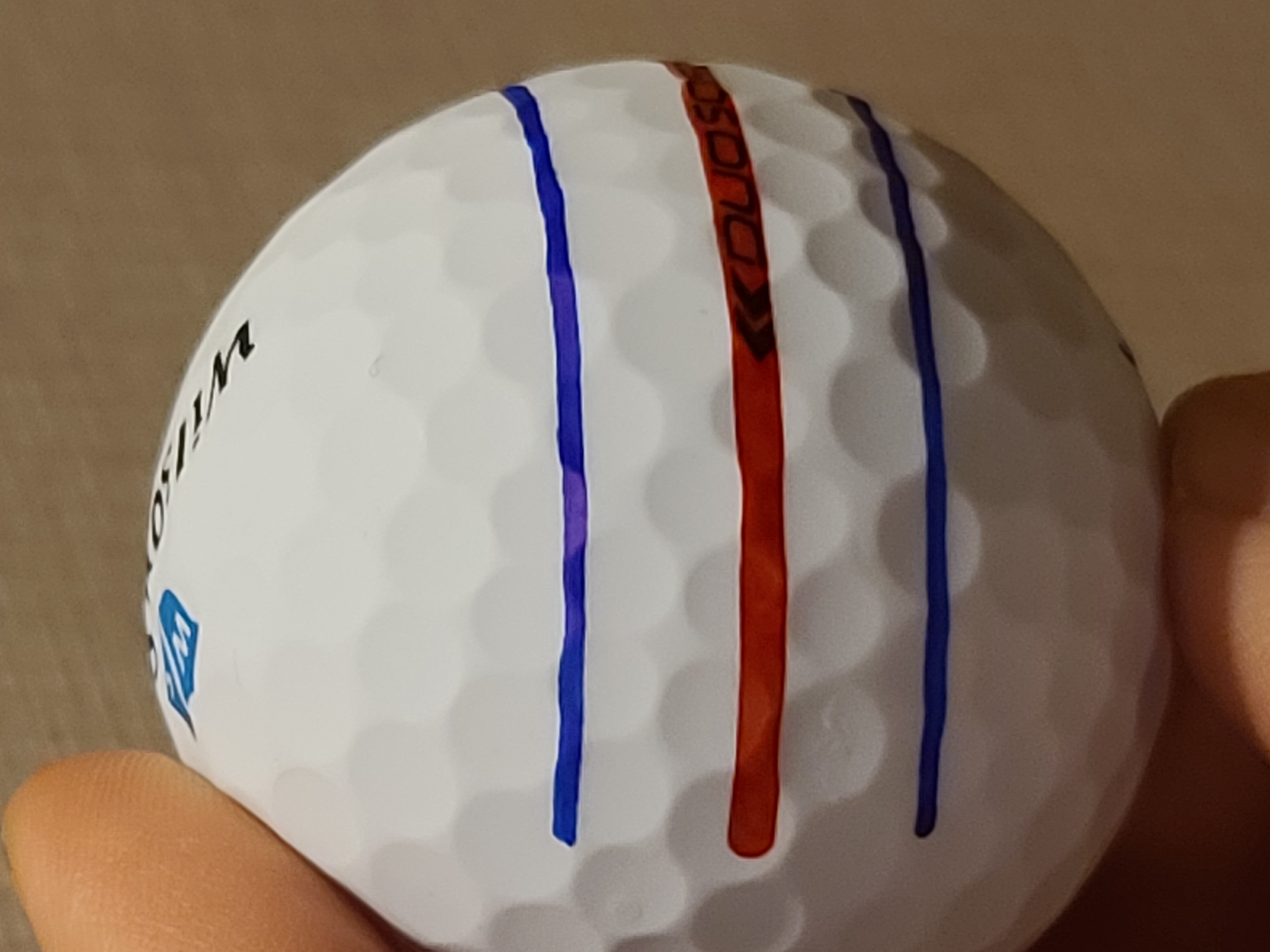 제 트리플트랙 텐퍼터 라인과 정렬했을때인데, 실제 트리플 트랙 공을 보면 라인이 거의 공의 절반에 걸쳐 그려져 있어 퍼팅할때 안정감을 주는데, 이 라이너도 볼 절반을 덮어서 그려지기 때문에 아래와 같이 시야게 라인이 길게 들어옵니다.