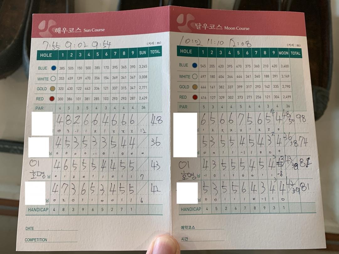 스콰는 라베를 기록했습니다. 일파 만파였는데 첫홀은 보기로 출발했고 막홀은 버디로 마무리 했는데 캐디분이 파로 적어놔서 고쳤습니다.