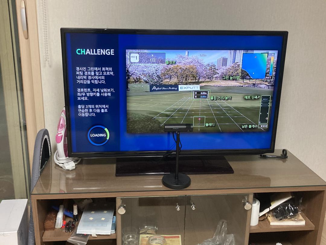 리모콘의 <?>를 누르면 골프존처럼 화살표가 표시 됩니다. 좌우 버튼으로 돌릴수도 있구요. 조금만 홀수가 늘어나면 매트 안에서 소화가 안되는 사태가 발생하니까 적당히 돌려서 치시는걸 추천드립니다. 그리고 살짝 숨겨진 기능인데 연습장 모드에서 셋업들어가시면 좌측 아래에 측정하기 던가 하는 매뉴가 있습니다. 이걸 누르면 30개의 랜덤한 거리 를 내주고 그걸 분석해주는 모드가 있습니다. 분석후에 저장을 해서 퍼팅실력의 상승을 비교해주기도 하죠. |