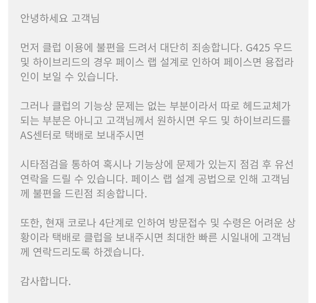 이게 클럽의 기능상 문제가 인지 아닌지 누가 판단하는건가요? 상식적으로 헤드페이스에 용접라인이 보이는게 정상인가요? 헤드교체가 되는건 아니고 시타점검을 해보고 연락을 드린다는건 결국 그냥 써라? 할말이 없네요 피로도 누적되면 라인따라 크렉 가능성 있습니다 |