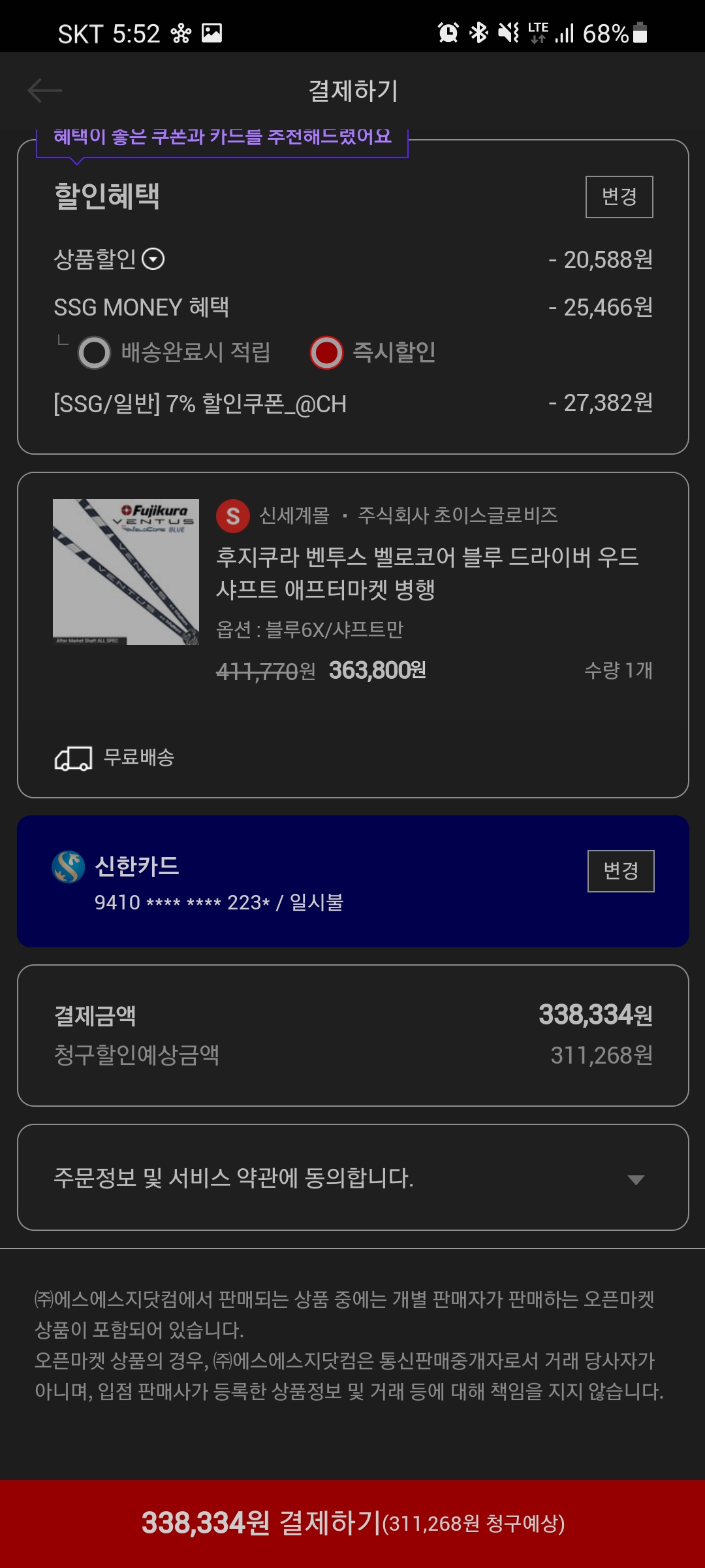 7퍼 쿠폰 적용시 34정도인데 신한카드 쓱페이 등록하니 2만원 청구할인