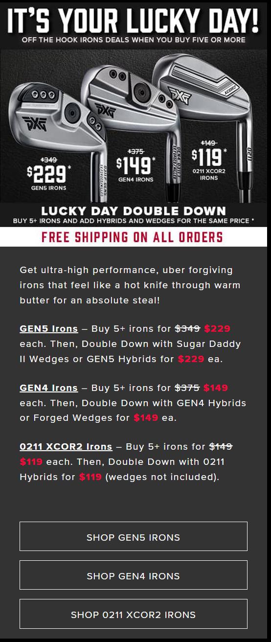 - Lucky Day Double Down: 아이언 5개이상 구입시 하이브리드나 웨지를 아이언 가격으로 할인