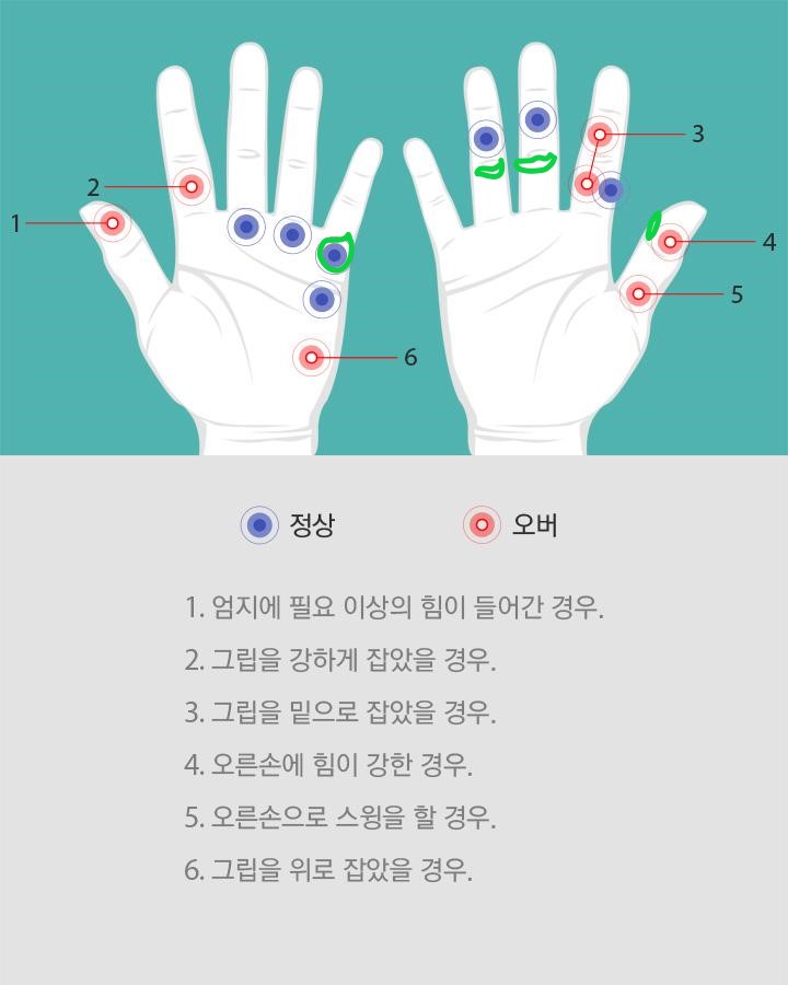 파란색 위치를 보면 검지에는 굳은 살이 없고요, 중지랑 약지의 저기 2번째 마디가 아니라 초록색으로 표시한 부분에 굳은 살이 생깁니다. 사진처럼 2번째 마디에 굳은살이 잡히려면 오른손으로 왼손 엄지를 좀 더 덮어서 잡는, 그러니까 오른손등이 좀더 중앙으로 보이게 잡아야 되더라고요. 그런데 그렇게 잡으니 백스윙 탑에서 헤드가 너무 앞쪽으로 쏠리는 느낌을 받는데.. 이게 맞나 모르겠어요 ㅠ 코칭프로님께 여쭤보니 그냥 편한대로 하라고 하면서도 제 스윙에는 지금의 그립이 더 맞는 것 같다고 하시더라고요;