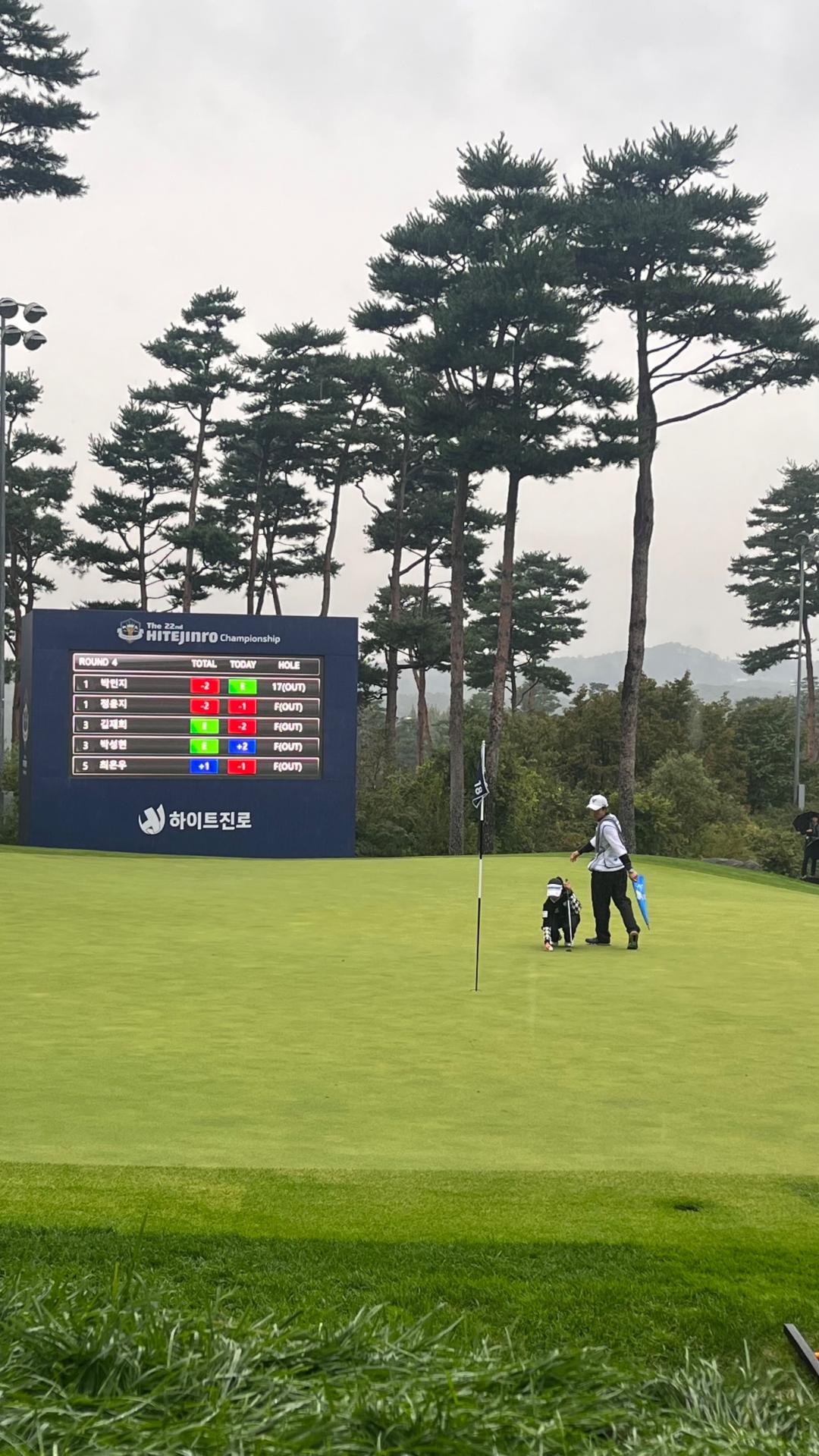 오후는 18홀 그린 주변에 자리를 잡고 프로 선수들의 경기 마지막을 지켜 보았습니다.