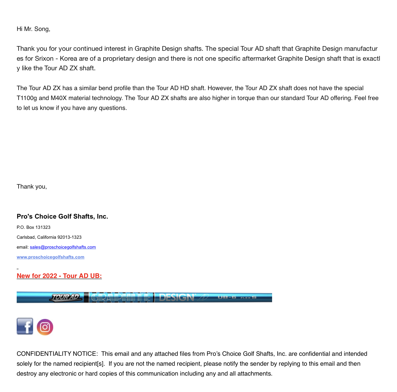 이름만 ZX이고 애프터마켓 샤프트인 HD 모델과 같다는 의견이 있어 메이커 그라파이트디자인 쪽에 메일 문의를 넣어 다음과 같은 답변을 받았습니다