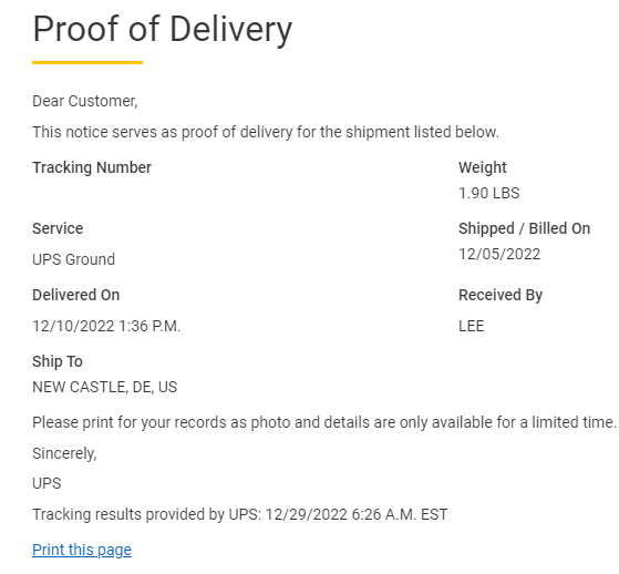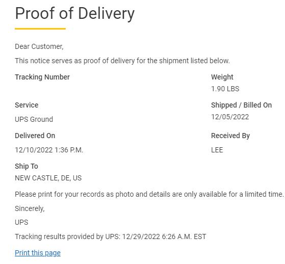 저랑 매우 유사한 케이스네요. 저도 12.5일에 주문 완료, 10일 델라웨어 도착(전달자 Lee). 지난 금요일 UPS 측에 요청해서 investigationopen, 오늘 캘프 측에 메일 보냈는데요. 기대를 내려놓아야겠네요…. |