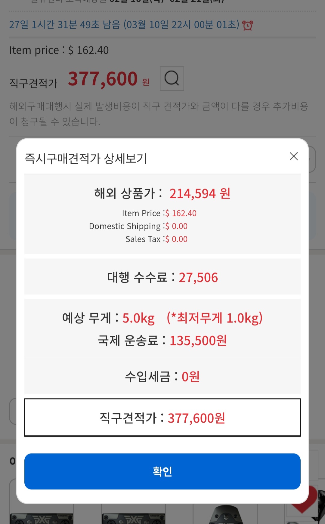 옥베이에서 한국 우리집 주소넣으면 수수료 받고 바로 보내줬는데 예전에는 국제운송료가 5키로에 4만5천원이였는데 갑자기 13만5천원으로 올랐네요;;